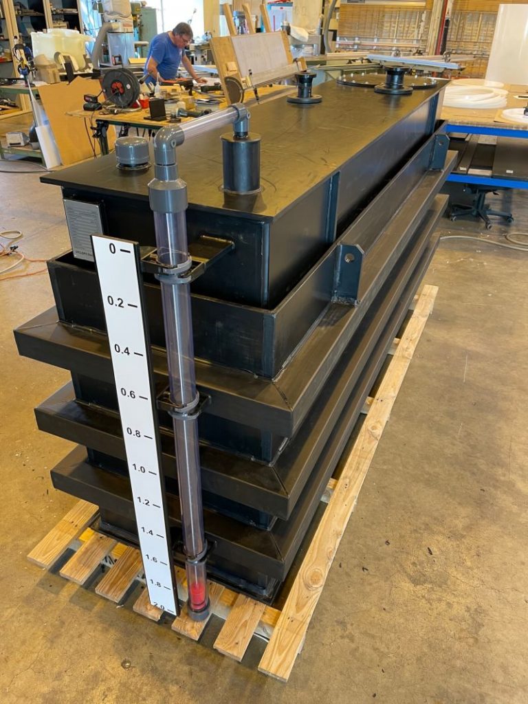 Cette cuve de stockage PEHD (polyéthylène haute densité) sur-mesure avec rétention intégrée d’une contenance de 2m³ a été spécialement dimensionnée pour le passage des portes sur son site d’installation, et dimensionnée par nos soins selon les normes en vigueur et sur une durée de 25 ans.